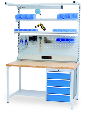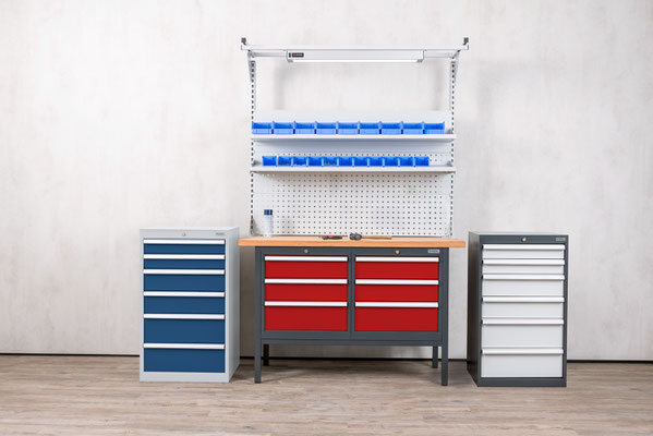 Schubladenschränke, Werkbänke, Arbeitstische, Packtische und umfangreiches Zubehör